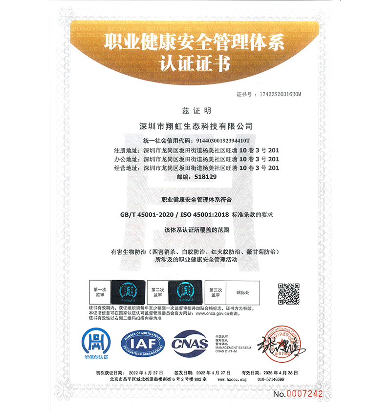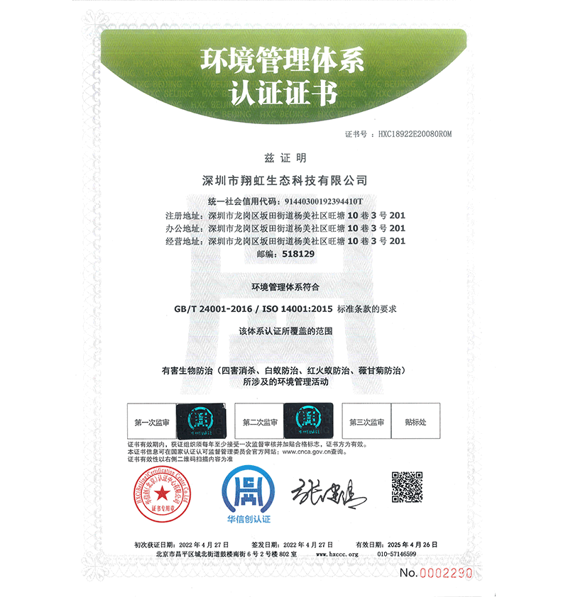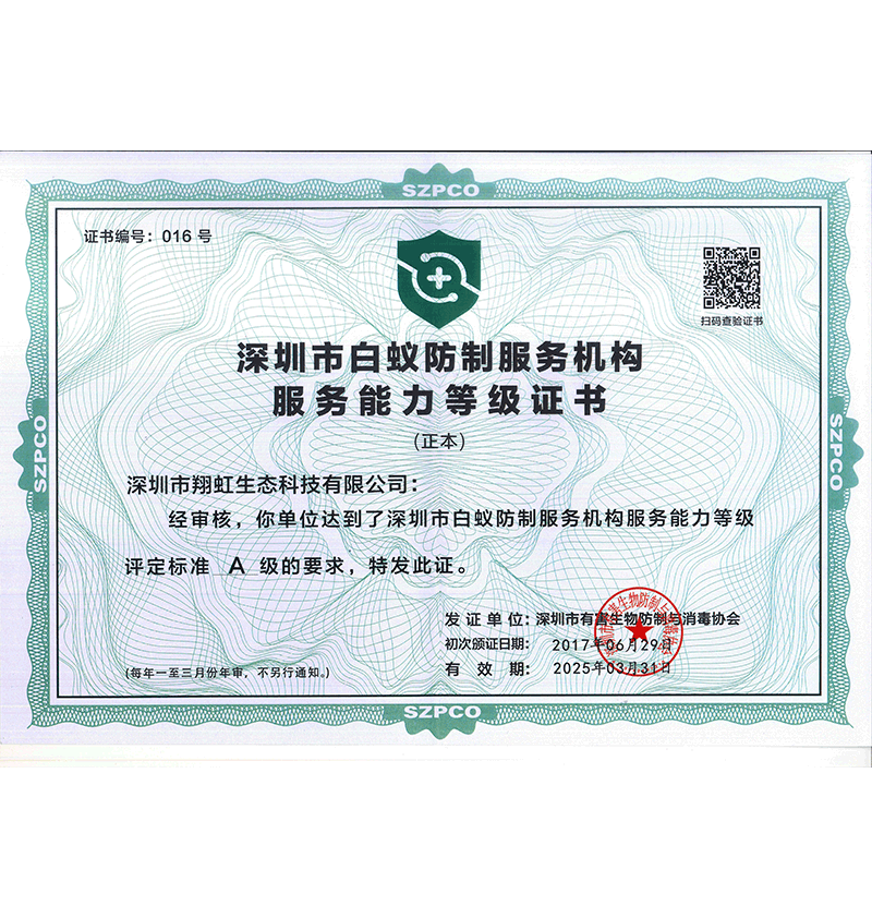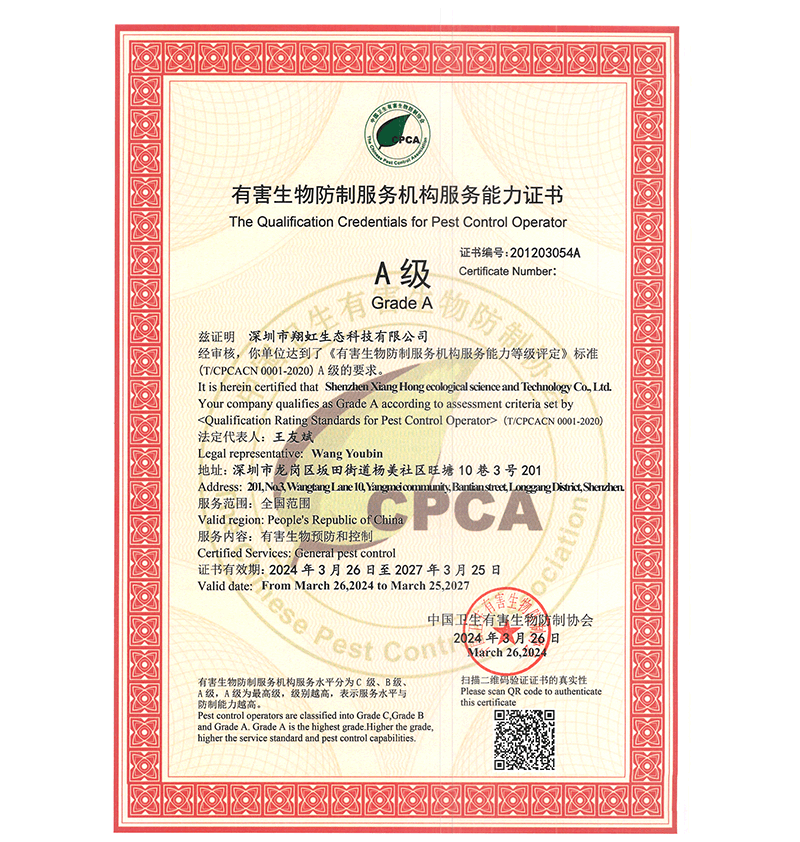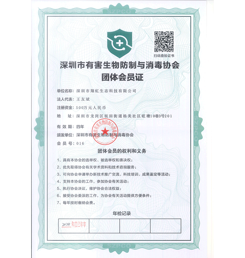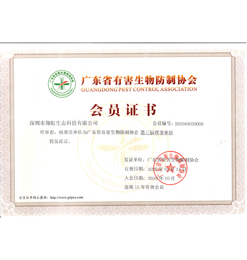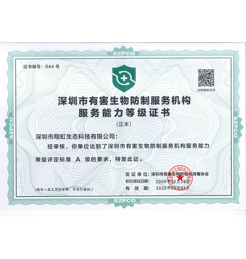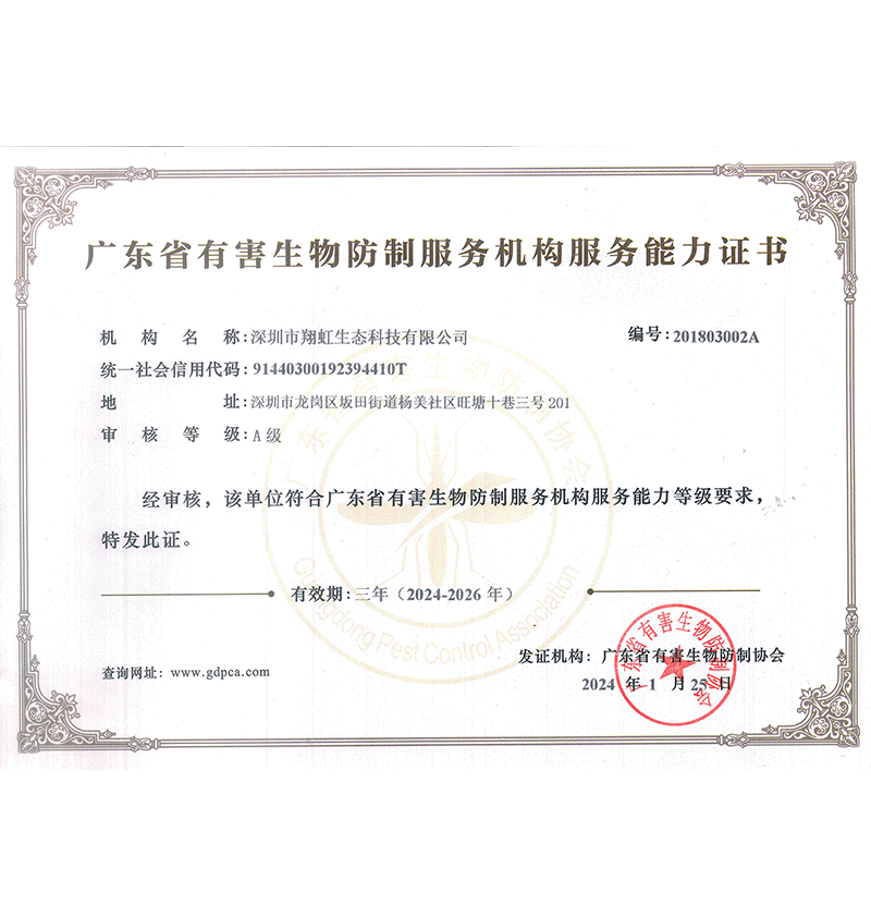 深圳市翔虹生態(tài)科技有限公司成立于1995年,是深圳最早成立的專業(yè)蟲害防治公司之一。公司發(fā)展至今獲得全國(guó)有害生物防制服務(wù)A級(jí)資質(zhì)、廣東省有害生物防制服務(wù)A級(jí)資質(zhì)、深圳市有害生物防制服務(wù)A級(jí)資質(zhì)、廣東省有害生物防制服務(wù)A級(jí)資質(zhì)、深圳市有害生物防制服務(wù)甲級(jí)資質(zhì)的單位,是中國(guó)有害生物防治協(xié)會(huì)會(huì)員、廣東省有害生物防治協(xié)會(huì)會(huì)員、深圳市有害生物防治協(xié)會(huì)理事單位,多次獲得“深圳市十佳消殺單位”榮譽(yù)。